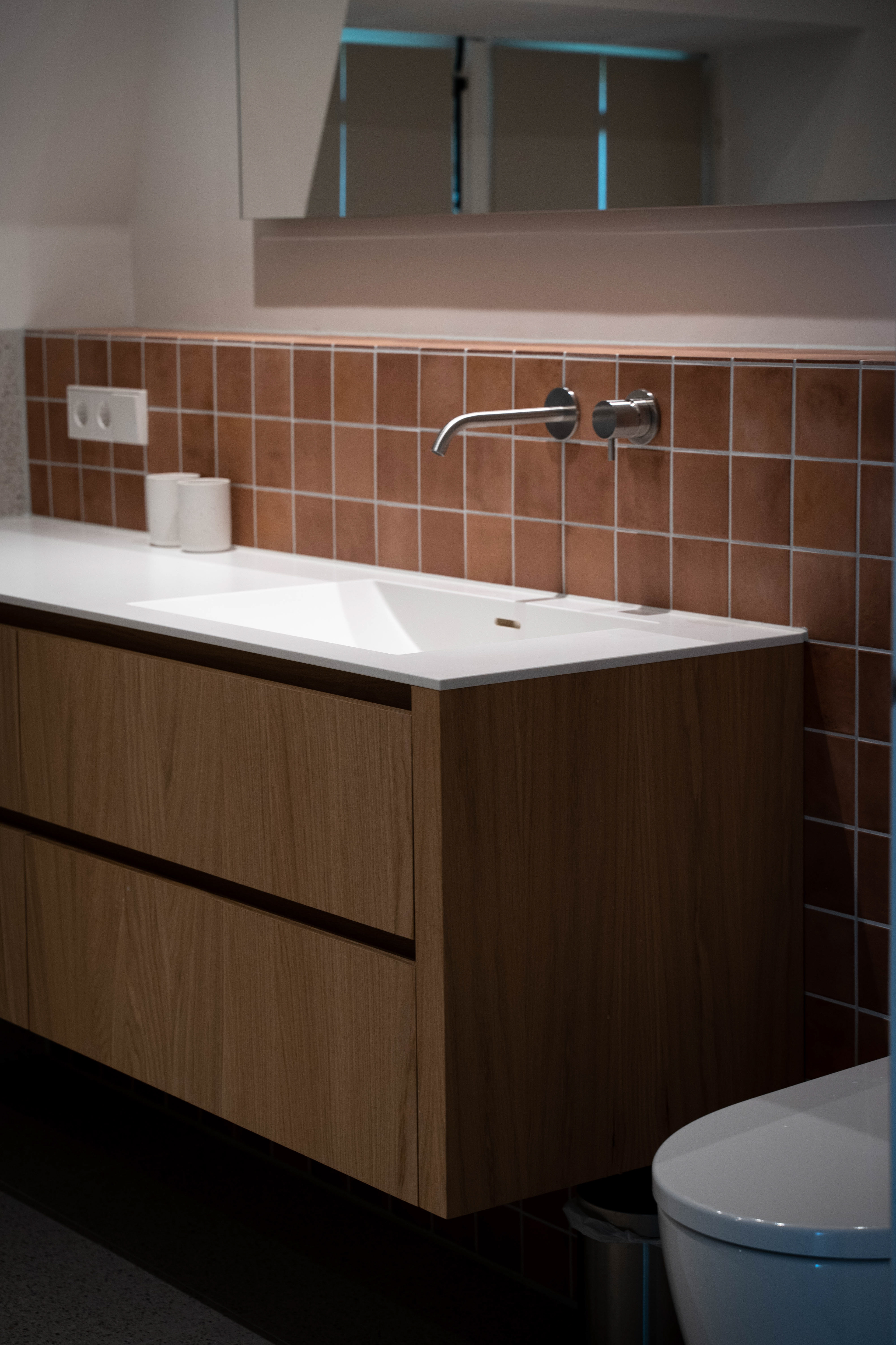 Badkamer meubel van eiken gefineerde panelen gecombineerd met een Solid Surface blad