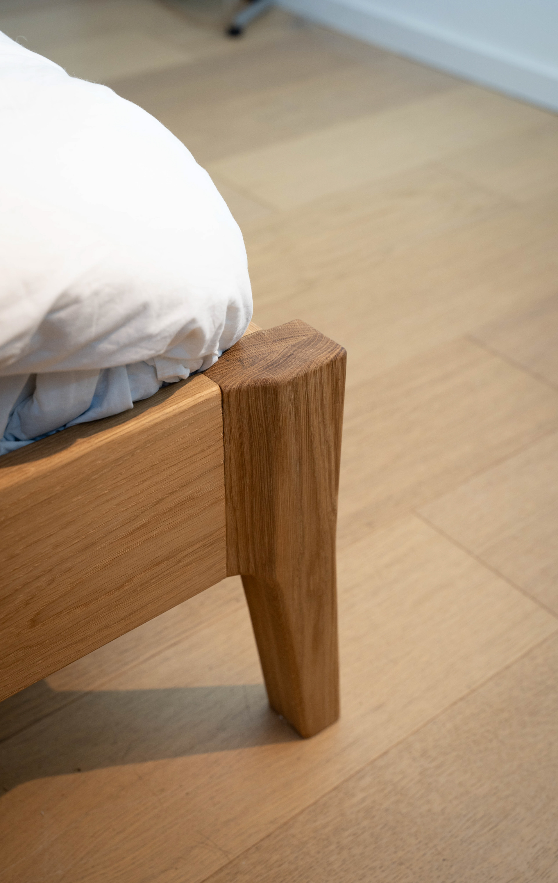Tweepersoonsbed vervaardigd in eiken hout. De poten van het bed zijn geïnspireerd op de vormen van de natuur en sluiten vloeiend aan op de rechte delen.