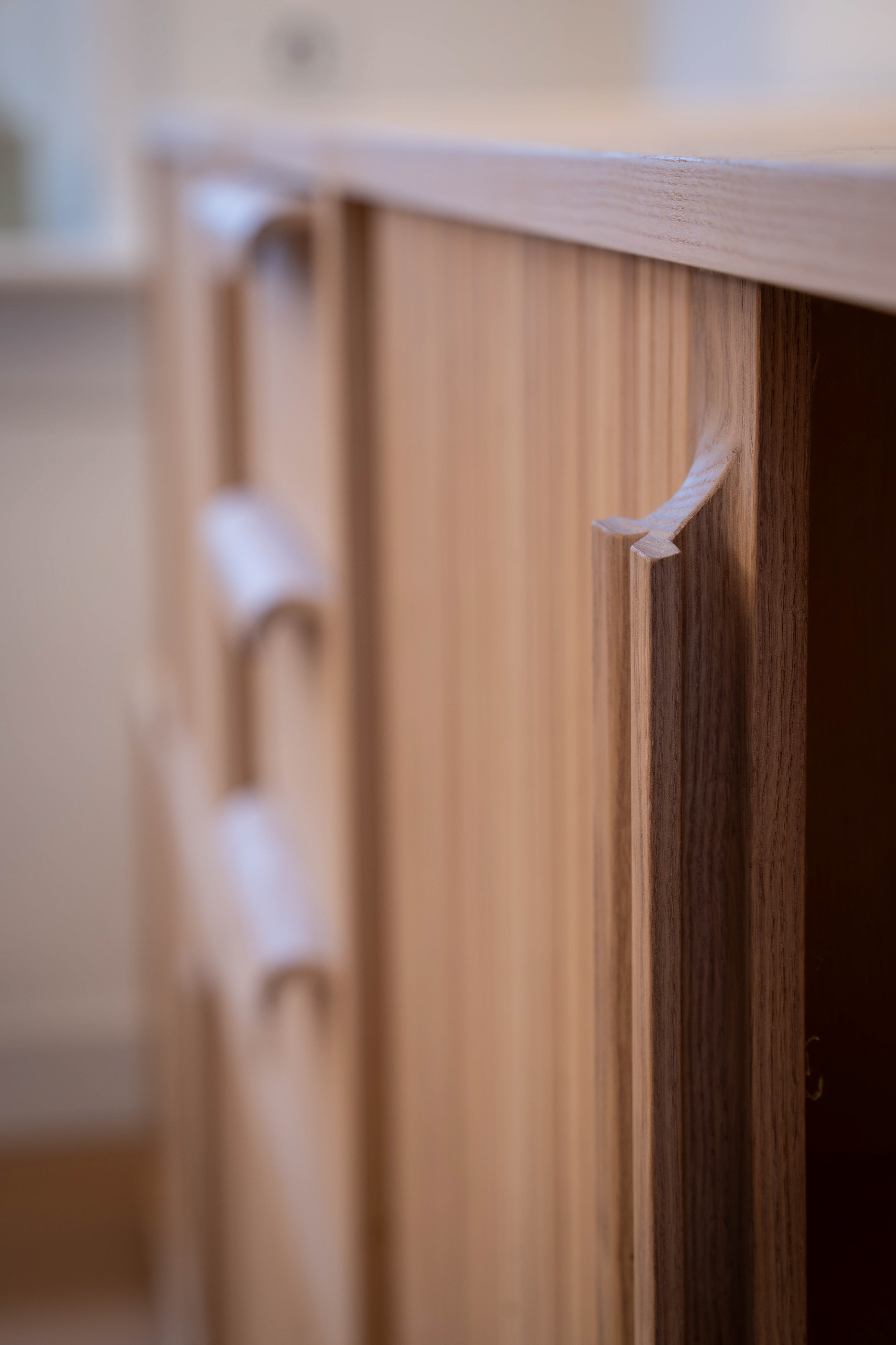Ik kreeg de opdracht om een bureau met kolomkast te maken. Samen kwamen we tot dit ontwerp. De kleurencombinaties en unieke details zoals doorlopend bureaublad, afgeronde hoeken en handvaten passen goed bij de rest van het interieur. Gemaakt van massief/gefineerd essenhout en wit gespoten zijpanelen.